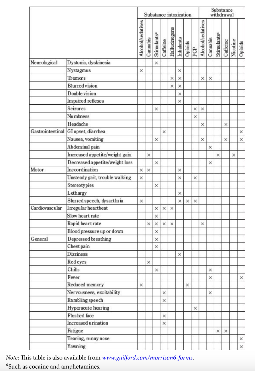 This table is a good way to visualize substance induced symptoms that clients might be experiencing.