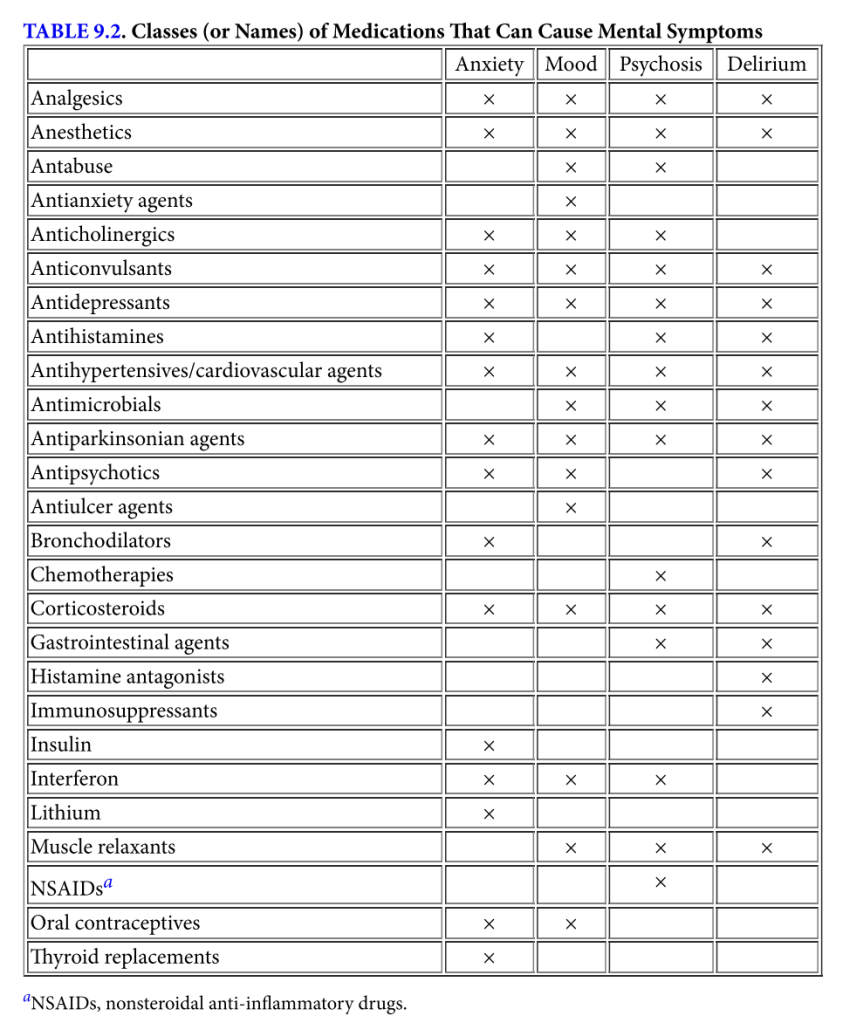 Here is another table that is useful to understand how different medications can affect a client’s physical and emotional symptoms.