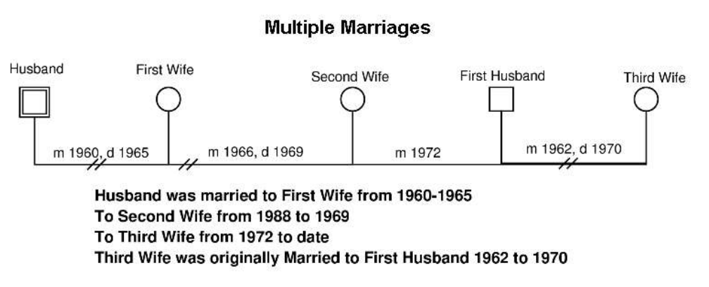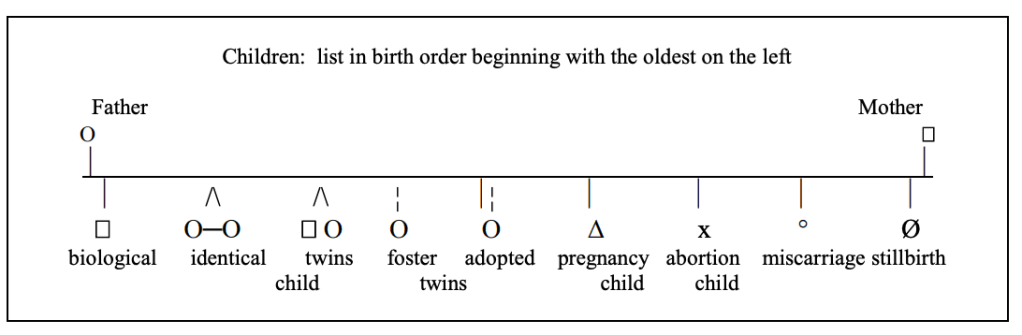 Examples and common symbols from Monica McGoldrick (2016) are shown below. They are also saved as one download on the downloads page.