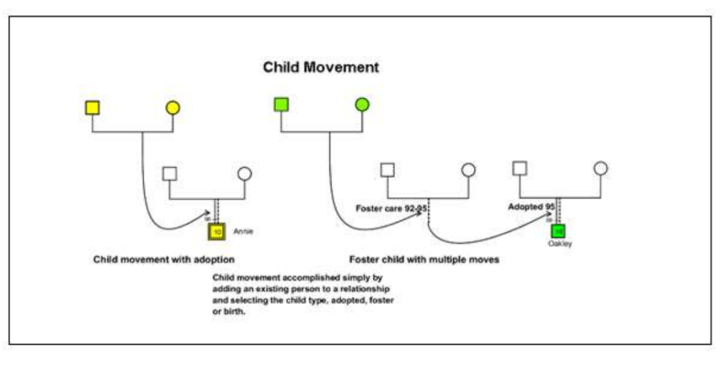 The State of Kansas Department for Children and Families Prevention and Protection Services (2020) has another useful document with more symbols involving children moving between homes and more complex family relationships. You can find it on the downloads page.