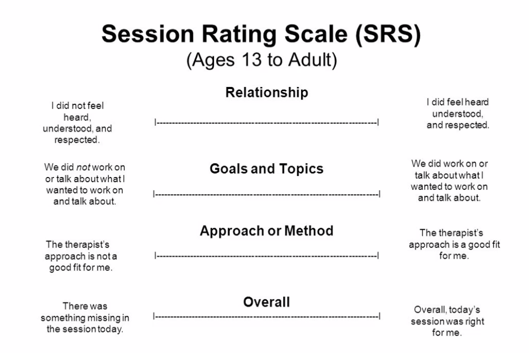 Duncan, B., Miller, S., Sparks, J., Claud, D.A., Reynolds, L. R., Brown, J., & Johnson, LD. (2003). The Session Rating Scale: Preliminary Psychometric Properties of a “Working” Alliance Measure. Journal of Brief Therapy. 3. 3-12.